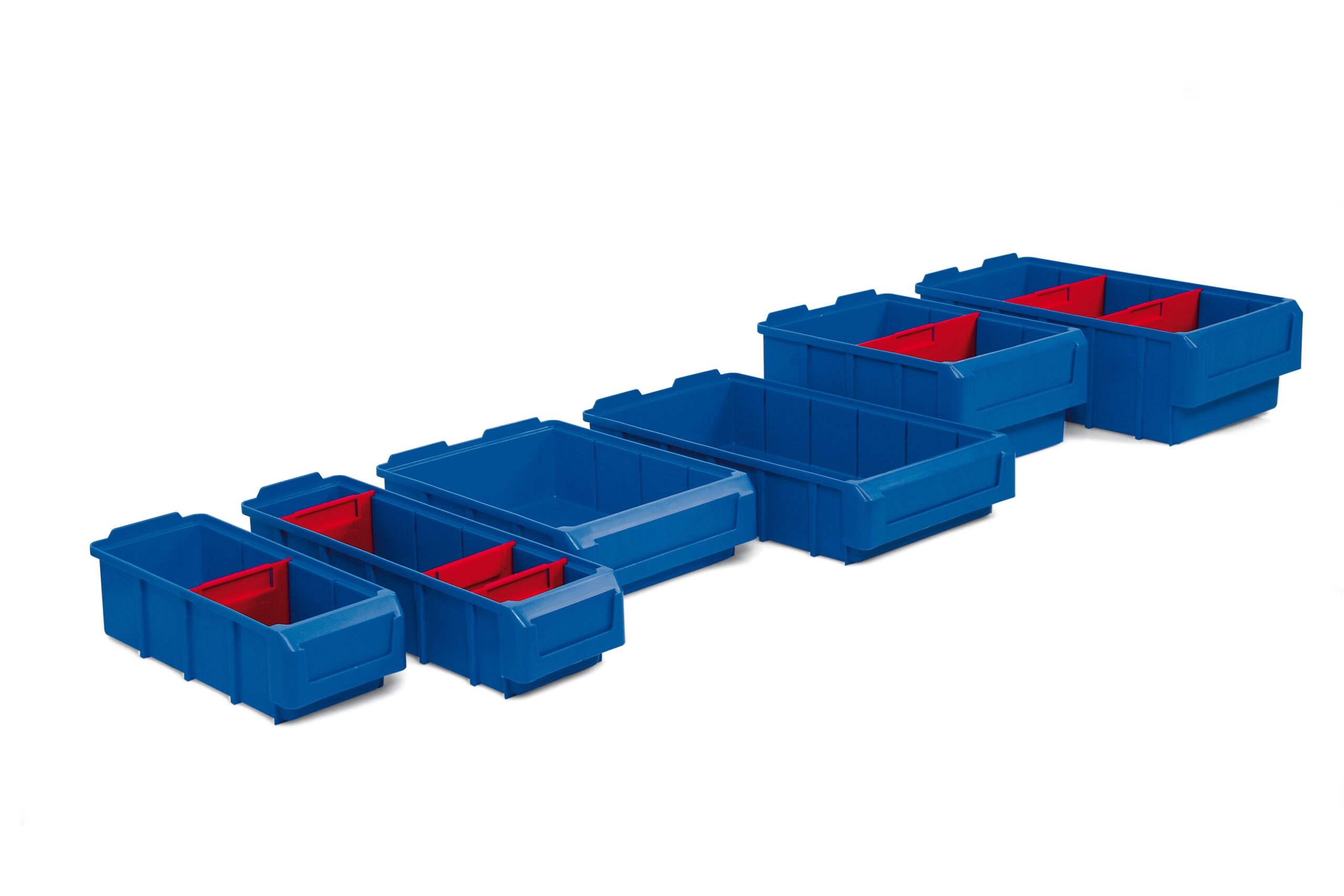 Cajones para estanterías de polipropileno . Color disponible en azul. Se pueden dividir interiormente mediante separadores. Precio variable según cantidades.
