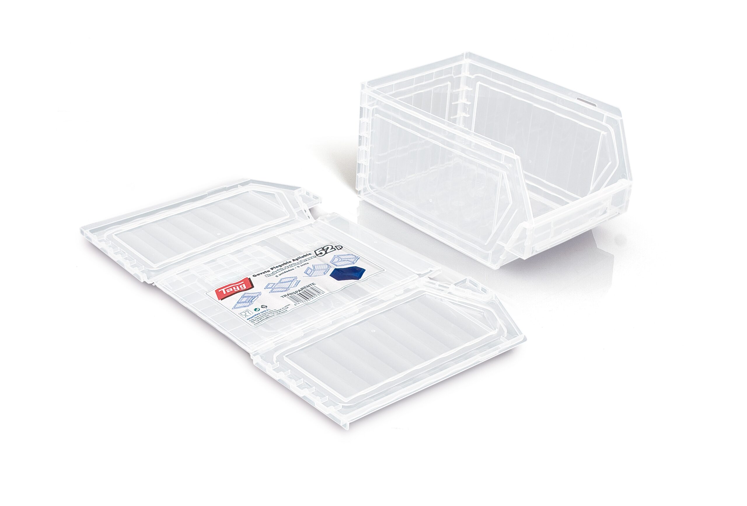 Kit de 5 gavetas de plástico plegables y apilables en altura. Tarifa de precios para colores en azul y transparente.